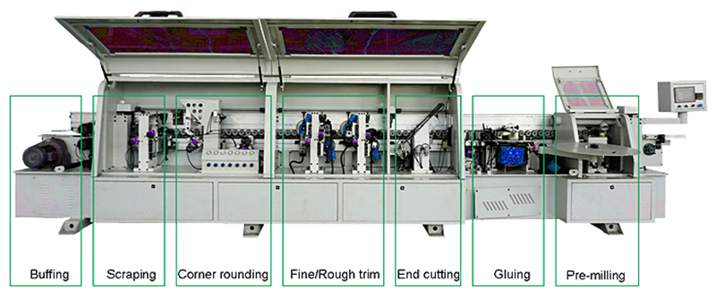 Tell máy dán cạnh tự động có 8 chức năng chính, chủ yếu dùng để dán cạnh bàn, tủ, tủ, đồ nội thất dạng thẳng. Ứng dụng keo tự động và chính xác, đánh bóng hai mặt một mảnh. Keo được bôi đều và truyền tải ổn định.