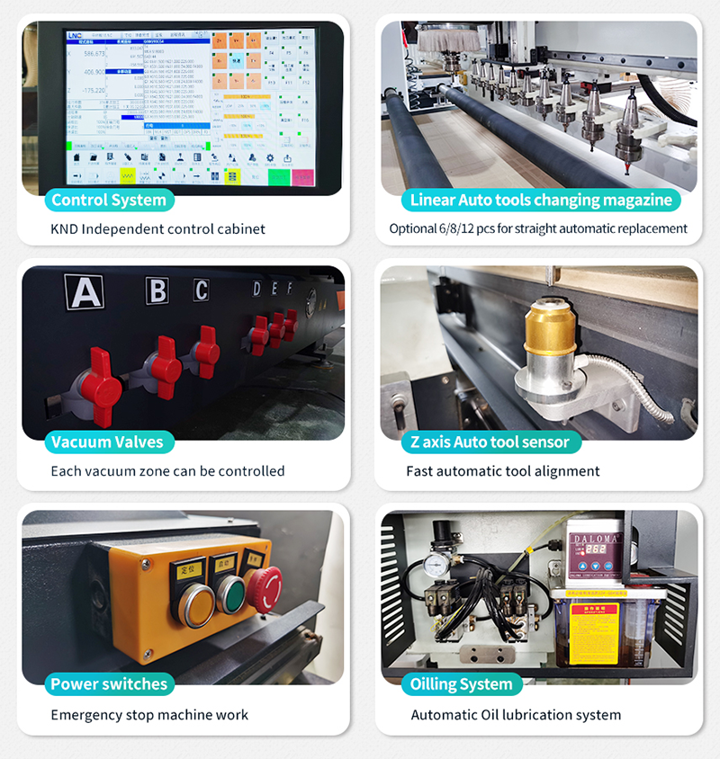 Bộ định tuyến CNC gỗ atc giá xuất xưởng áp dụng hệ thống điều khiển LNC Đài Loan, 12 công cụ thay đổi nhanh chóng. Nó có độ cắt mịn có độ chính xác cao. Chủ yếu được sử dụng trong chế biến đồ nội thất bảng điều khiển.
