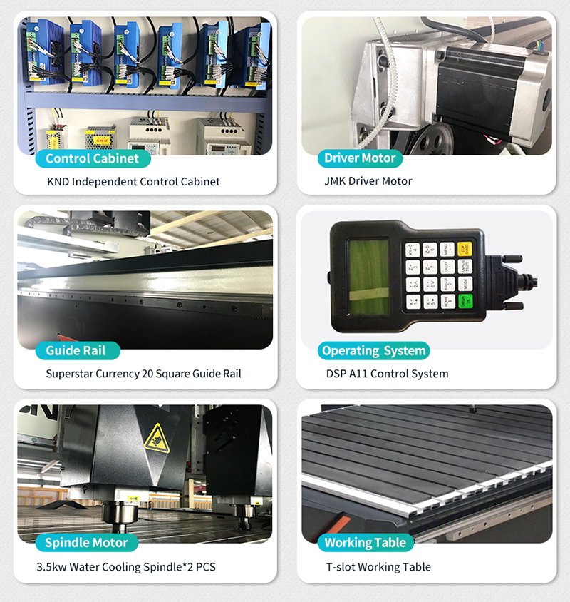 Máy khắc hai đầu chủ yếu được sử dụng trong sản xuất ngành gỗ và trang trí quảng cáo. Giường được hàn bằng thép vuông thành dày, ổn định hơn các ống vuông thông thường. Giàn kiểu khay sử dụng kết cấu hàn thép vuông và tấm bên sử dụng kết cấu thép có thành dày, giúp giảm rung lắc trong quá trình xử lý một cách hiệu quả. Trục chính làm mát bằng nước công suất cao, chịu được nhiệt độ cao, kéo dài tuổi thọ của trục chính.